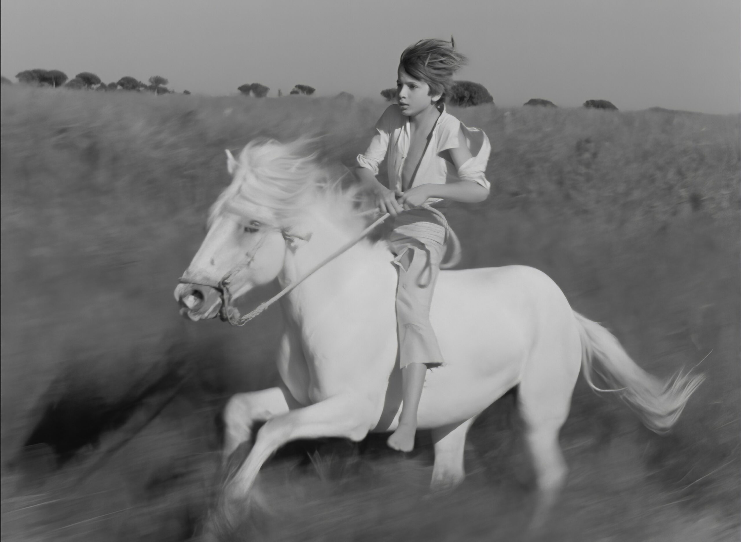 南仏カマルグ地方に、白く美しい荒馬をリーダーにした野生馬の一群がいた。“白いたてがみ”と呼ばれる馬の存在は噂となり、牧童たちは野生馬を捕獲し始める。漁師の少年フォルコは、牧童たちの手から逃れた“白いたてがみ”を見つけ、ひっそりと近づき、手綱を握った。ひきずられながらも手綱を放さないフォルコに、馬は次第に心を許す。しかし、すぐに牧童たちに見つかり、フォルコは馬をなんとしても守ろうとするが…。
