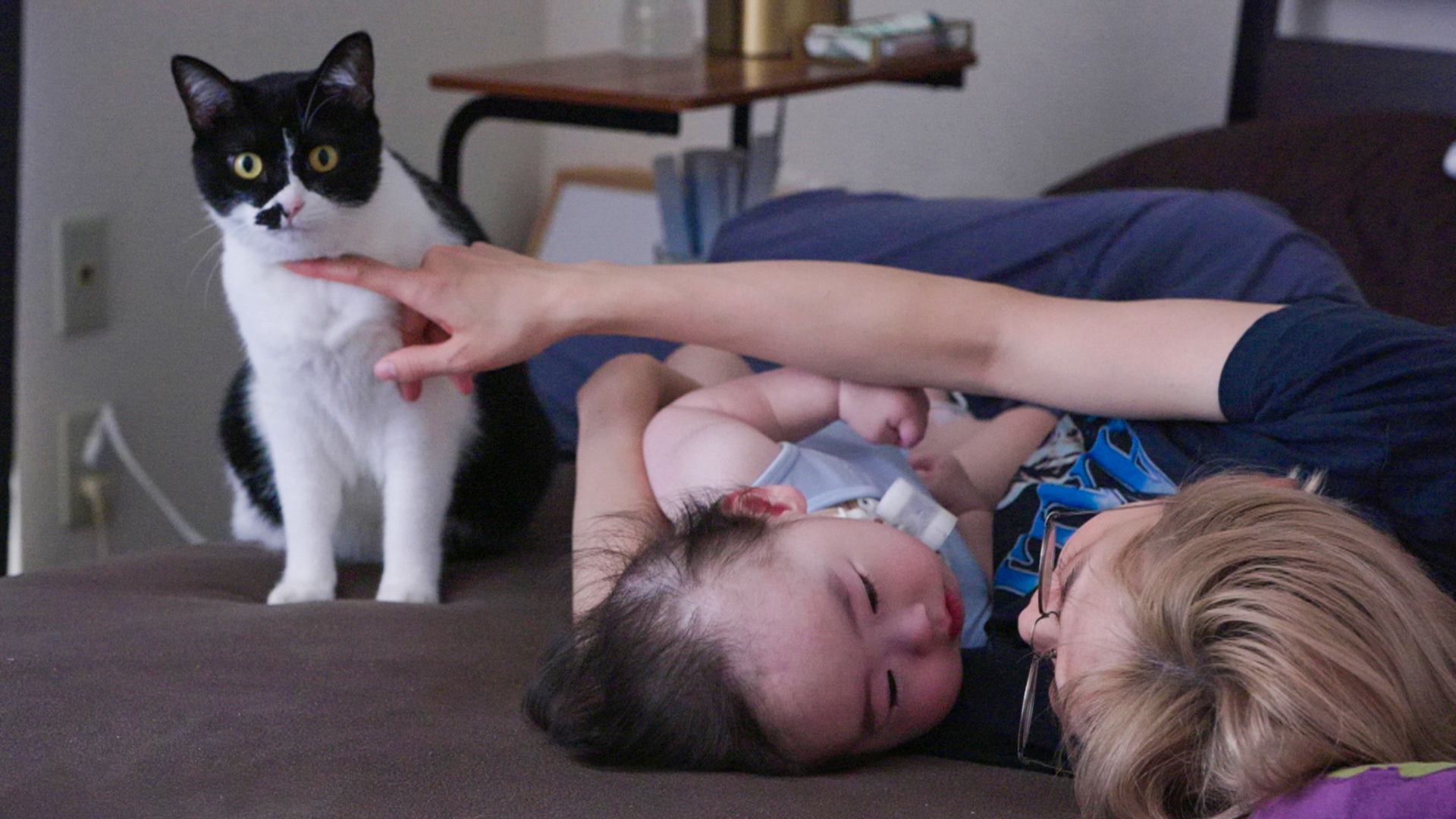 「かわいい~♡」もちりとした白い肌に何度も頬をすりよせる朱香(あやか)。家族の未来を想い、音楽制作やダンスに取り組むアーティストの隆一。ふたりには珀久(はく)が生まれたばかり。3人と猫のフィガロの暮らしには笑顔が絶えない。